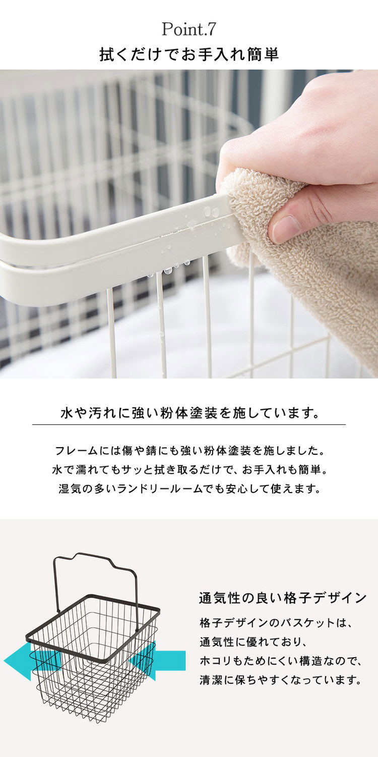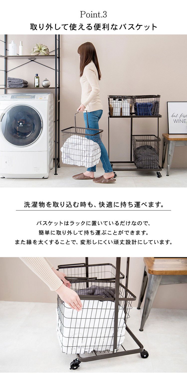 色柄物や汚れた洗濯物を分けて溜められるランドリーワゴン。バスケットは持ち運べて便利。