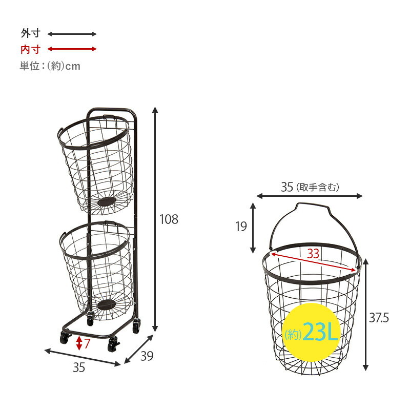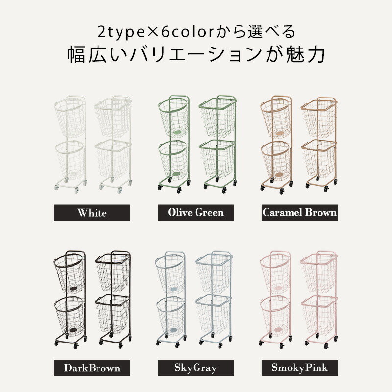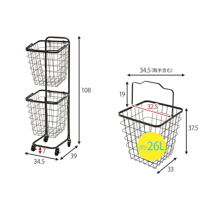 ワイヤーバスケット 2段 洗濯かご 【2タイプ×6カラー】 キャスター付 ランドリーラック 韓国インテリア 角型/ダークブラウン