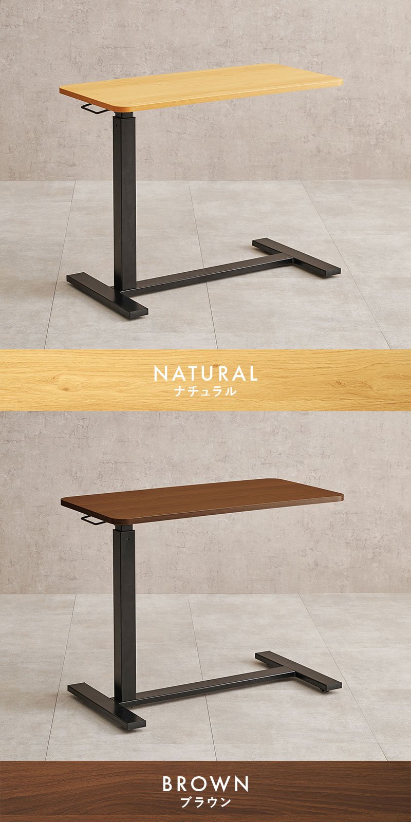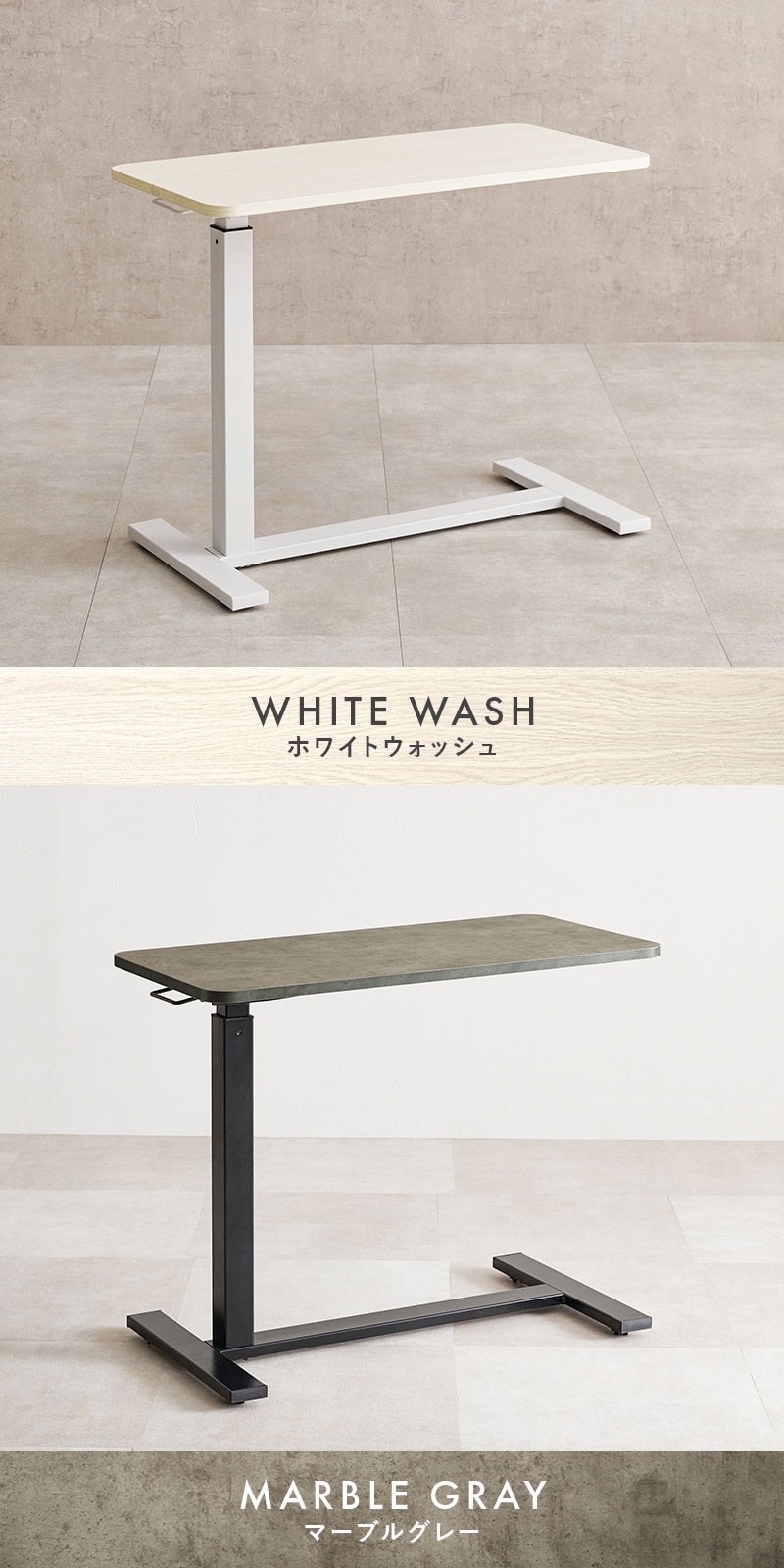 昇降式 サイドテーブル 隠しキャスター付き ガス圧昇降 高さ調節 80×40cm コの字 サイドテーブル ベッドテーブル 机 ソファテーブル ホワイトウォッシュ