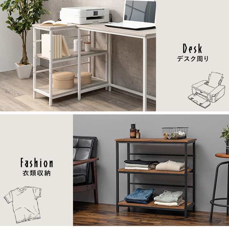 木目調の棚板にアイアンフレームを合わせたシンプルなデザインのオープンラック。3段タイプ