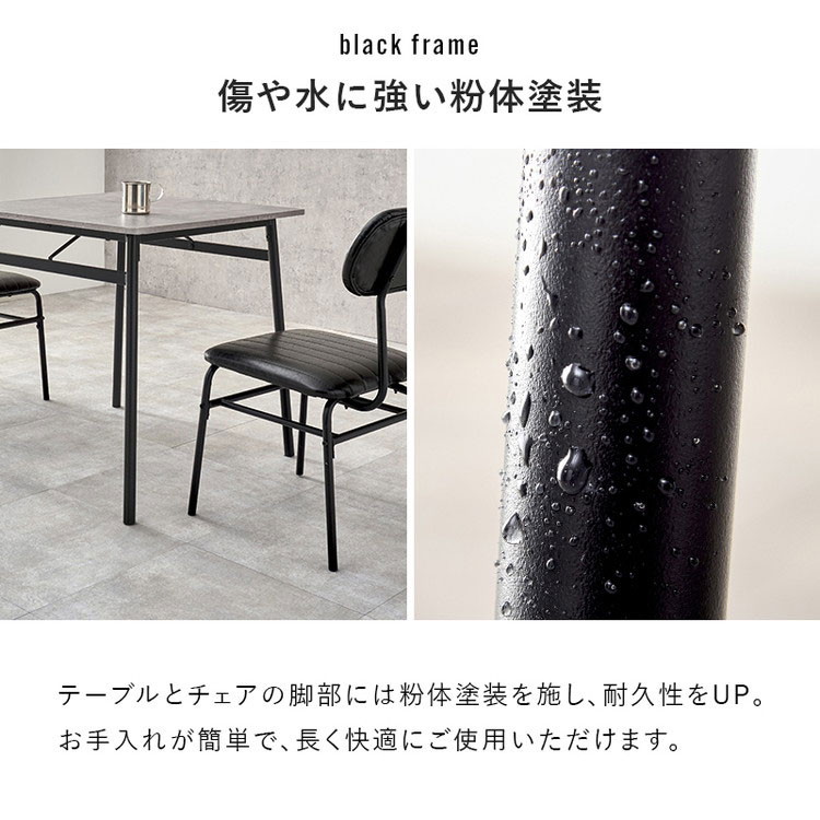 フレーム:スチール、天板:合成樹脂化粧繊維板(塩化ビニル)、チェア張地:合成皮革