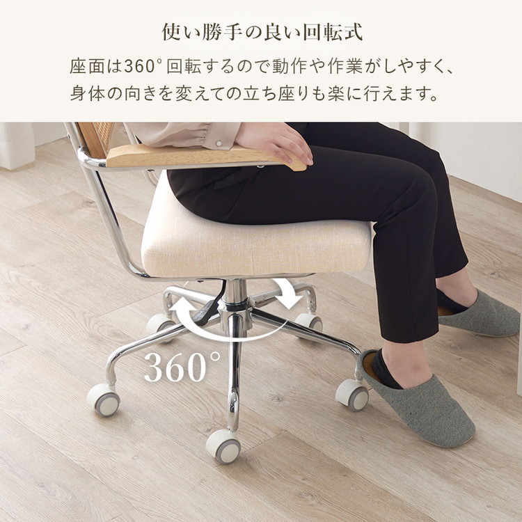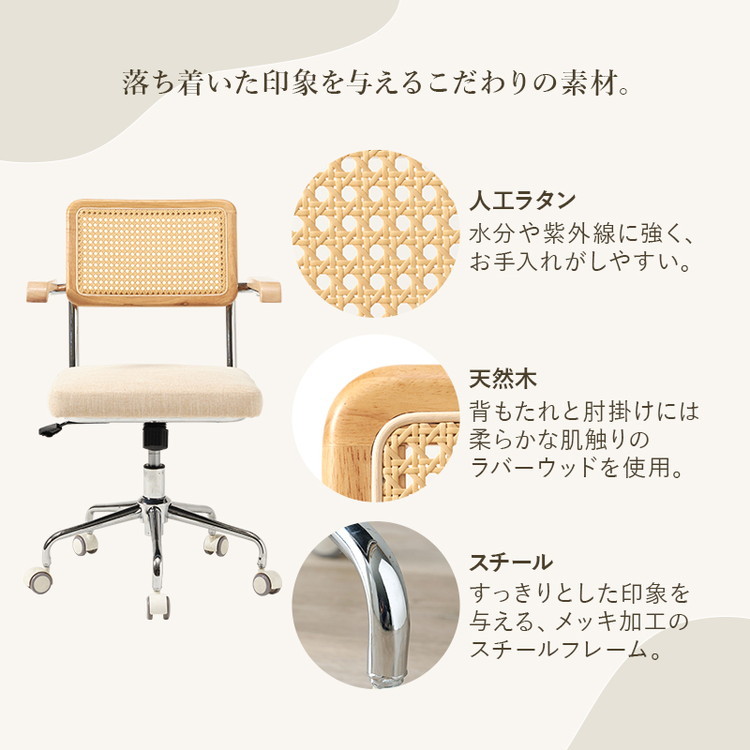 置くだけで自然な抜け感を演出するナチュラルテイストのラタン調オフィスチェア。肘掛け付き