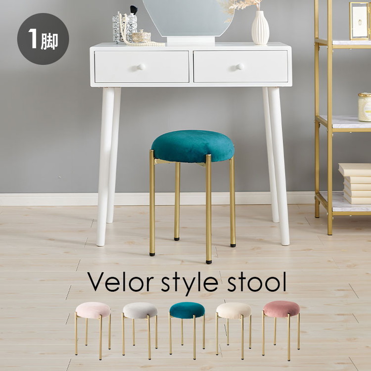 ころんとした座面にゴールドの脚がフェミニンなスツール。なめらかな触り心地のベロア風生地を使用しています。