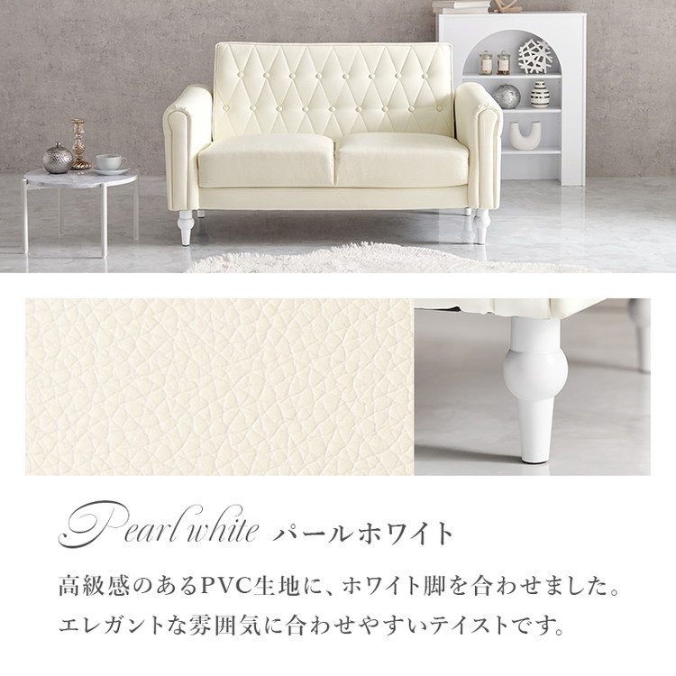 上品さと可愛らしさを掛け合わせた2人掛けソファ。背面のクロスボタンステッチや丸い肘掛けなど、こだわったデザインが魅力的