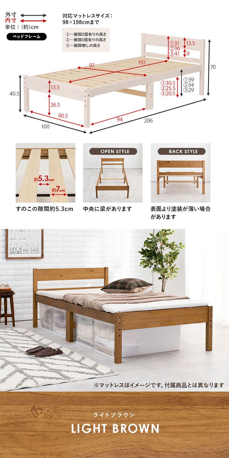 ベッド:(約)幅100×奥行206×高さ70×床面高39/34/29cm,マットレス:(約)幅97×奥行195×高さ20cm