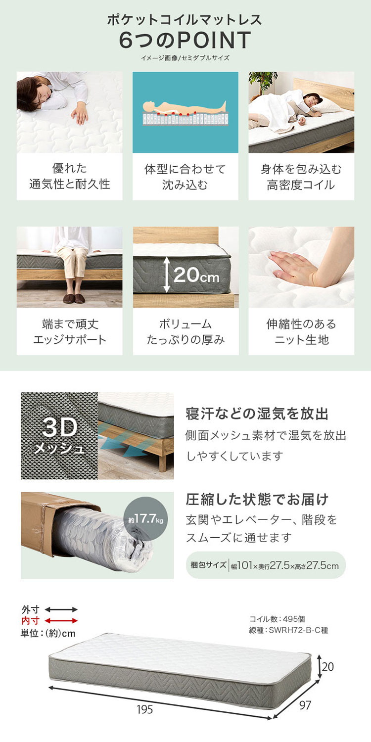 ベッドフレーム:天然木(パイン)、マットレス張地:ポリエステル、マットレス中材:ポケットコイル使用