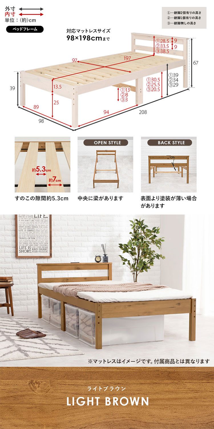 ベッド:(約)幅98×奥行208×高さ67×床面高39/34/29cm、マットレス:(約)幅97×奥行195×高さ14.5cm