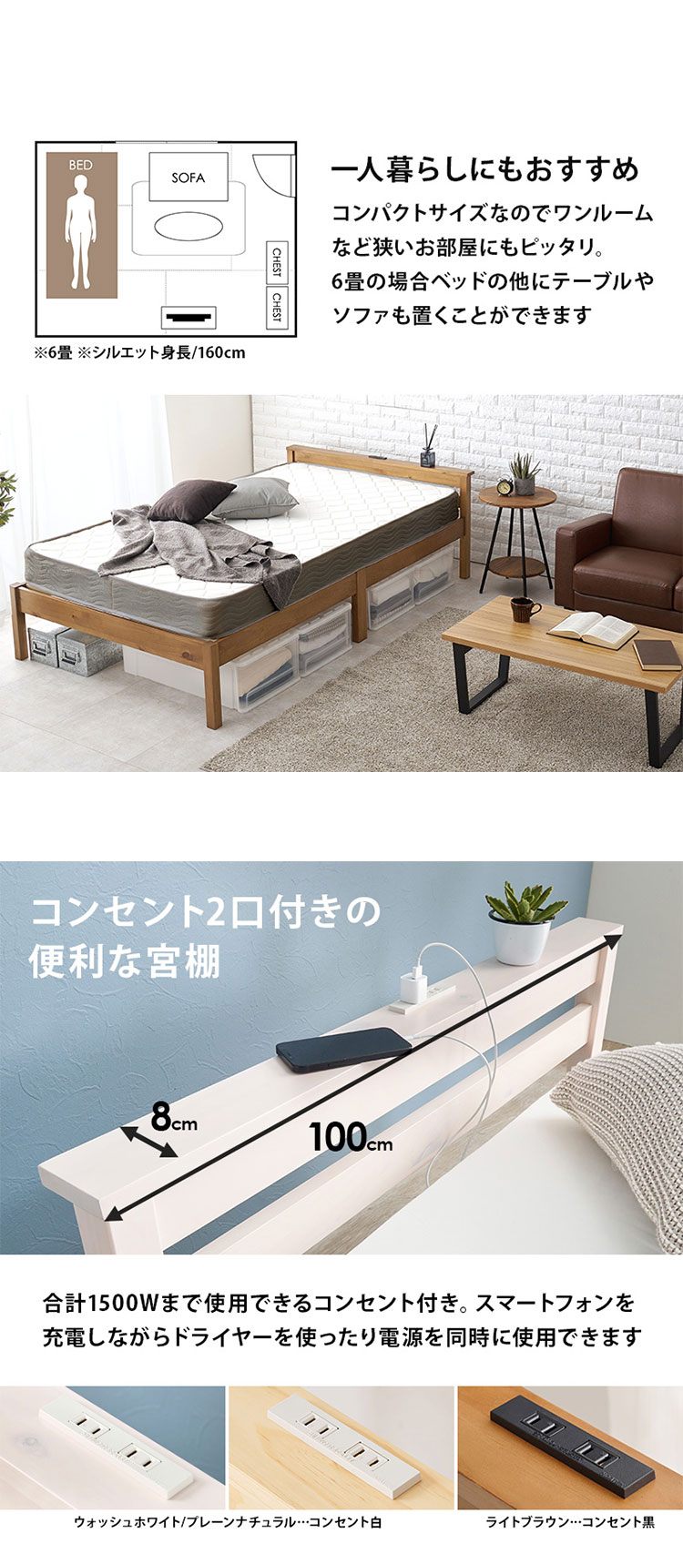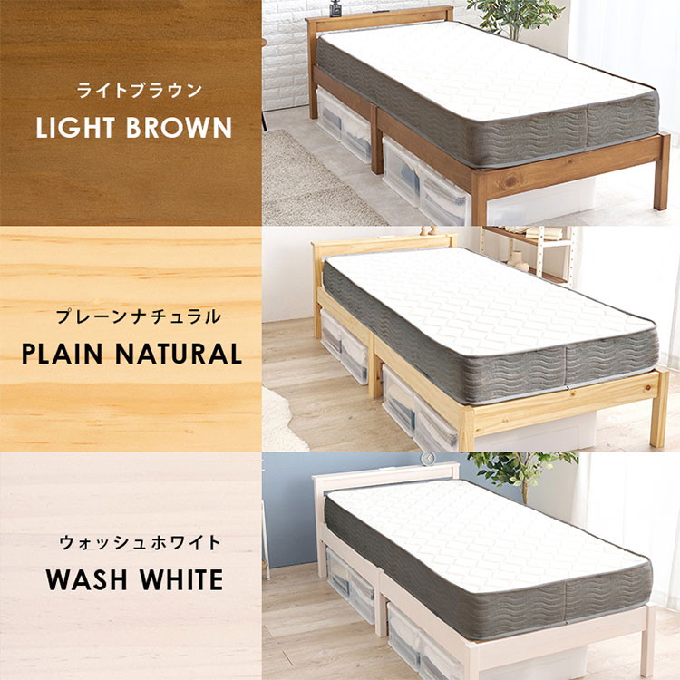 工具不要・簡単組立 棚コンセント付き ベッド シングル ボンネルコイルマットレス付き 2点セット 耐荷重200kg ライトブラウン