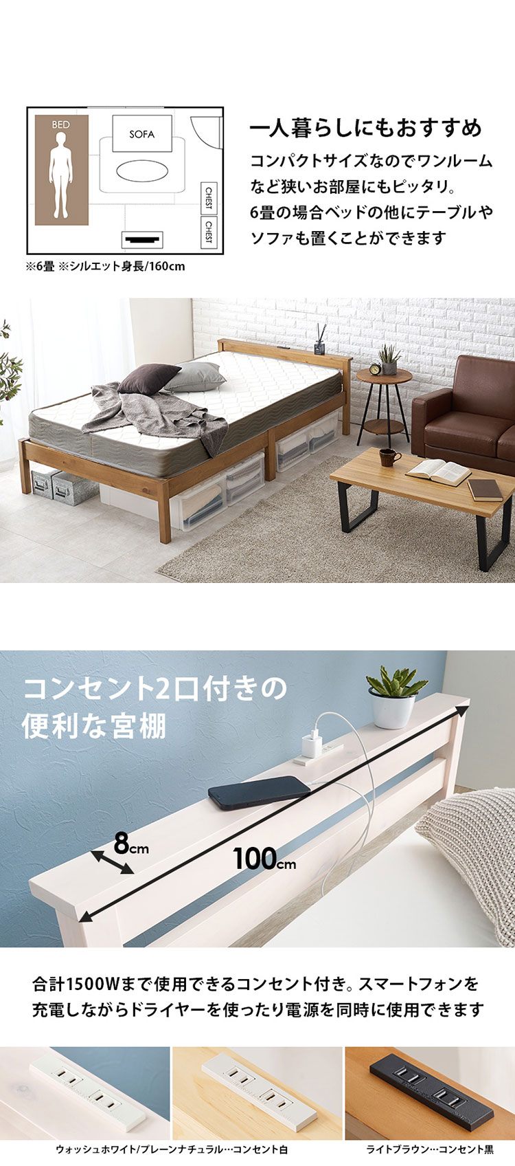 ネジなし、工具不要で簡単組立。模様替えや引っ越しにも便利なコンセント、宮付きベッドです。独立したバネが体型に合わせて沈みこむポケットコイルマットレスセット