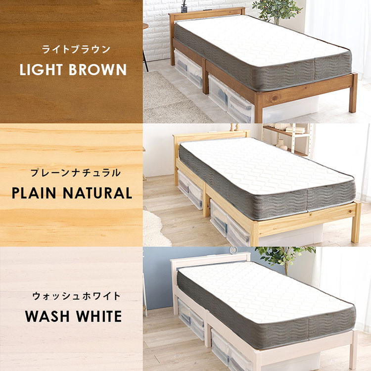 工具不要・簡単組立 棚コンセント付き ベッド シングル ポケットコイルマットレス付き 2点セット 耐荷重200kg ライトブラウン
