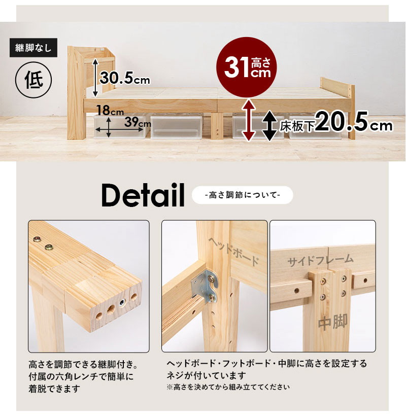 床面の高さが変更できる頑丈な造りのすのこベッド。宮棚に縁が付いているので物の落下を防ぎます。