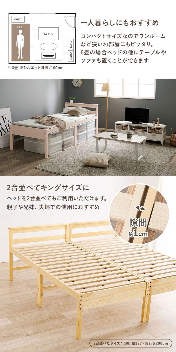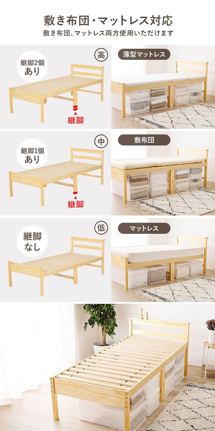 すのこベッド シングル 耐荷重200kg 天然木 ミドルベッド 高さ調節 3段階 大容量 収納スペース ライトブラウン