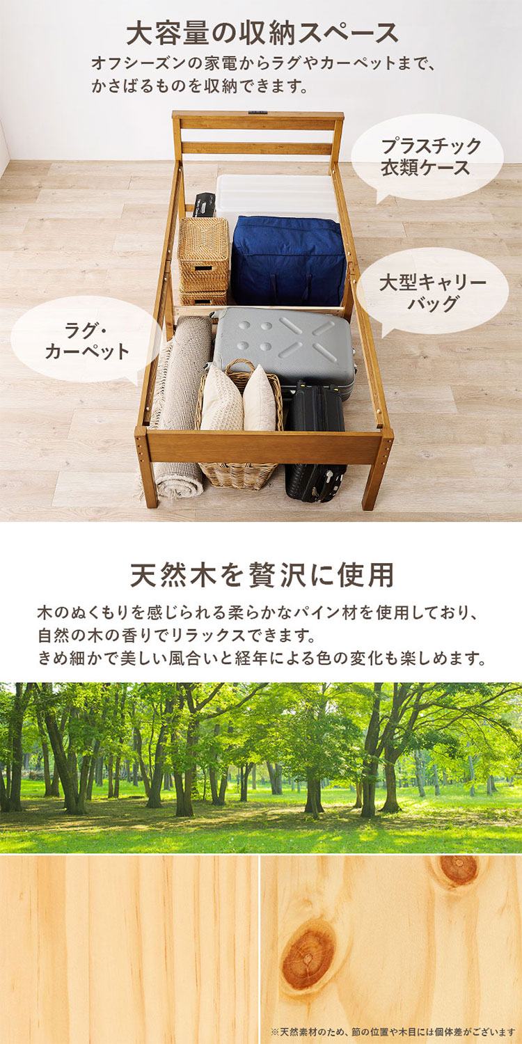 高さが調節でき、床面下が大容量の収納スペースに。頑丈なつくりの天然木すのこベッドです。