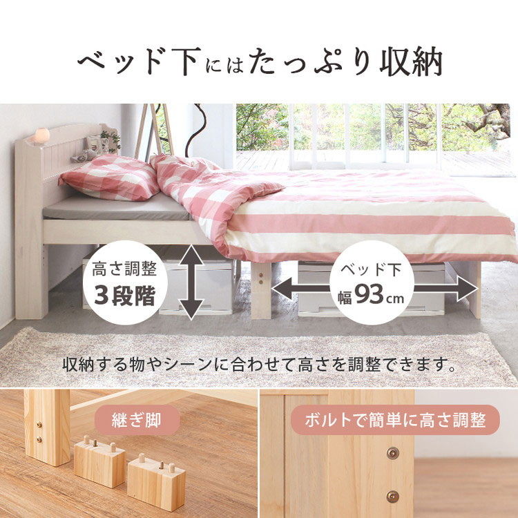 床面高さが3段階に調整出来る天然木すのこベッド。便利な棚と2口コンセント付き。体型に沿うように点で支え、体圧を分散するポケットコイルマットレスセット