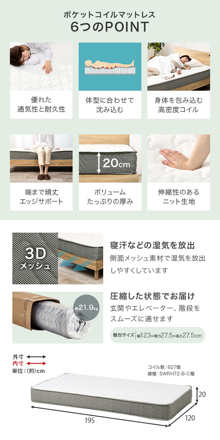 ベッド:(約)幅125×奥行211×高さ82×床面高31/37/43cm、マットレス:(約)幅120×奥行195×高さ20cm