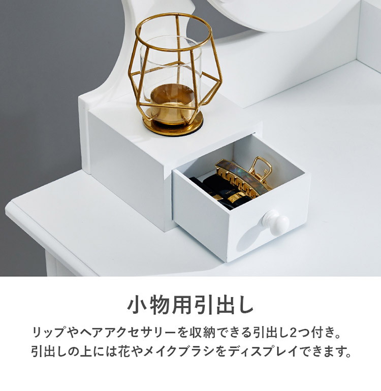 LEDの女優ライト付きドレッサーでロマンティックな雰囲気を堪能できます。上品な曲線脚のデザインを合わせたスツール付き