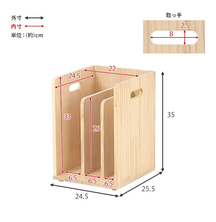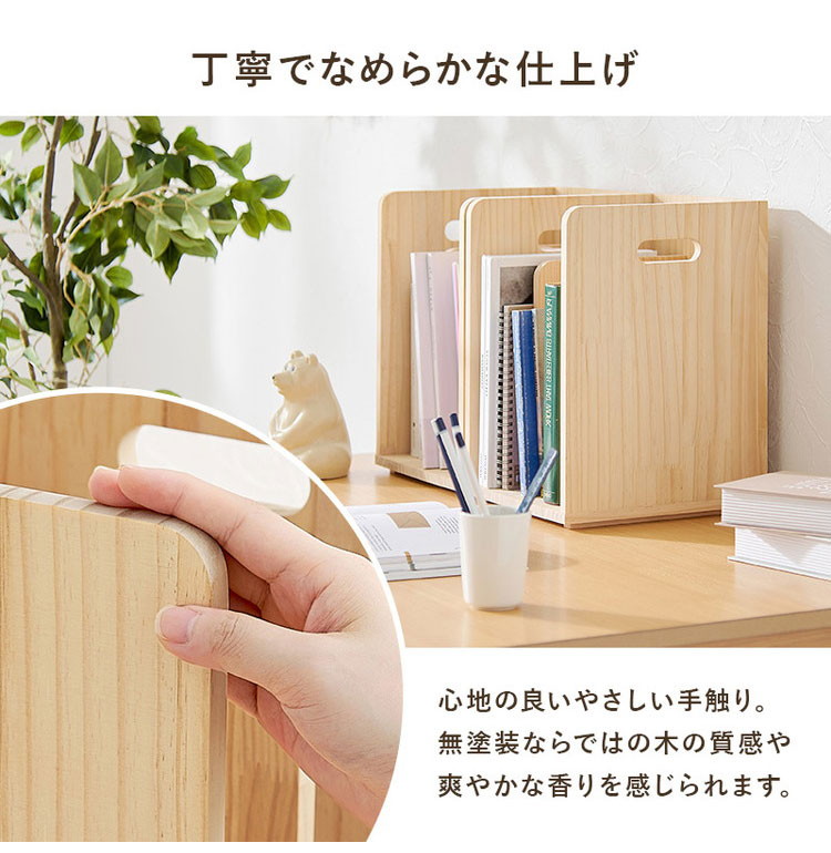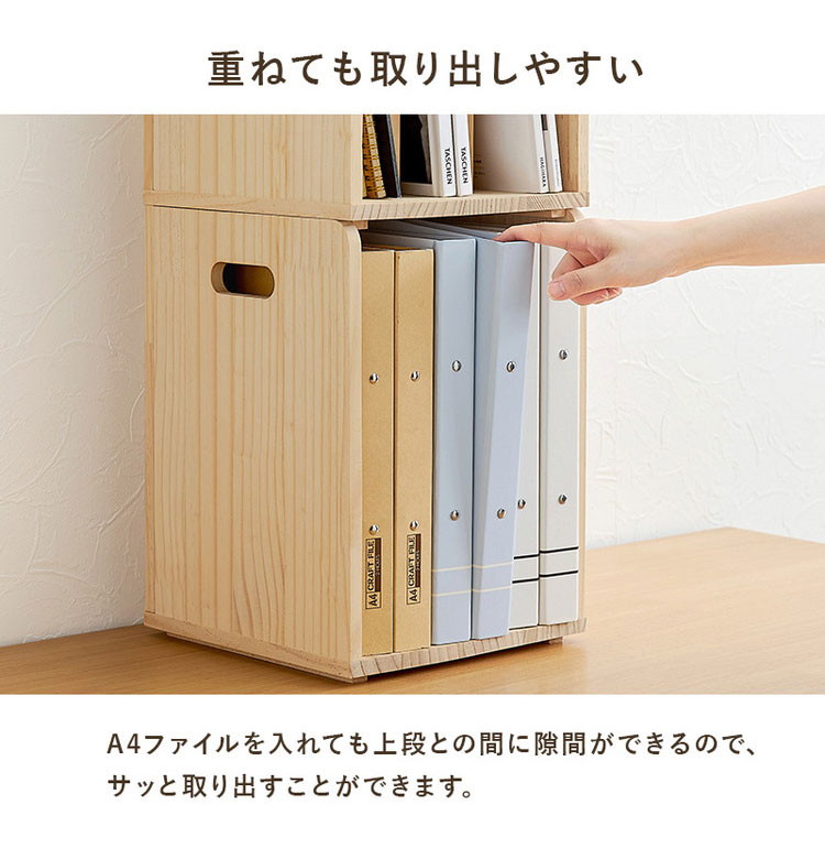仕切りが付いて本・雑誌をしっかり収納。重ねて使えます。天然木パイン材を使用しており、無塗装なので経年変化を楽しんだりDIYでアレンジしたりできます。
