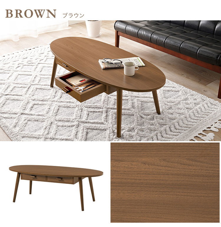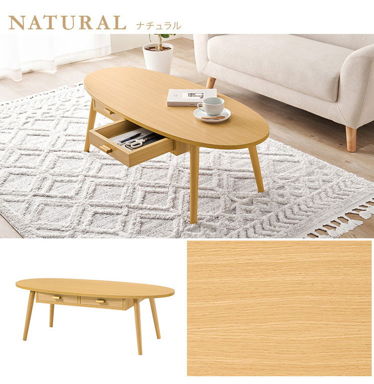 センターテーブル 引き出し付き 収納付き 110×48cm 楕円 オーバル ローテーブル 机 ナチュラル