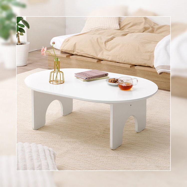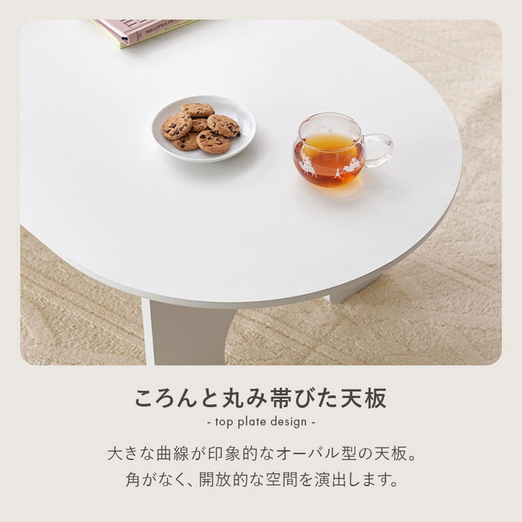 ころんとしたシルエットがかわいい、オーバル型のローテーブル。脚部をアーチ型にすることでシンプルなのに目を引くデザインに。