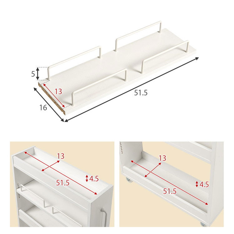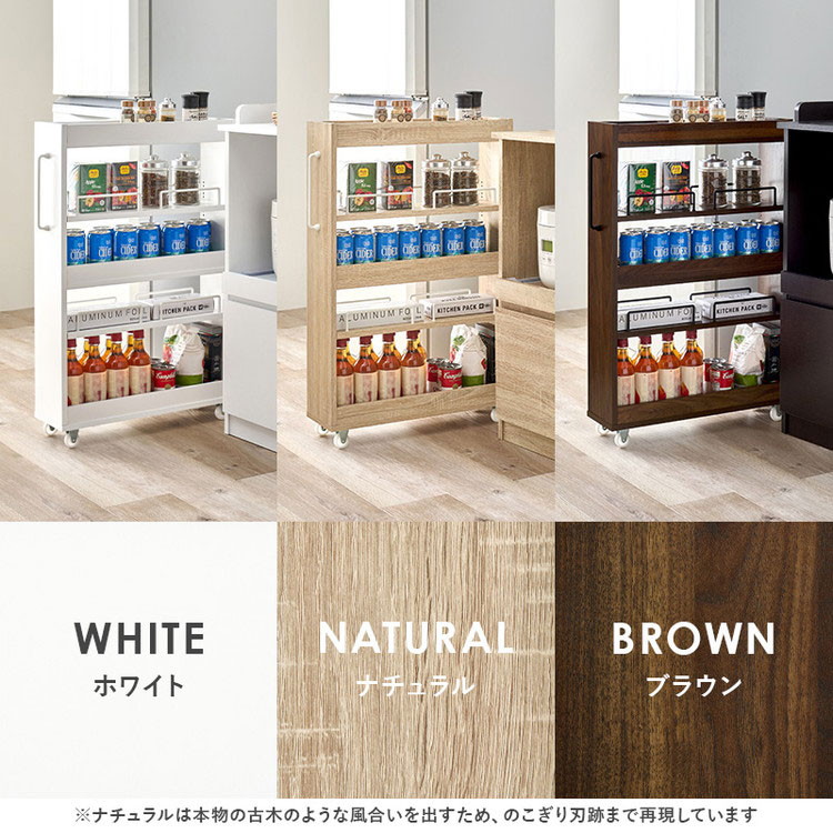 わずかな隙間に収まるスリムなワゴンラック。オープンタイプなので必要な時に取り出しやすく、キッチンやランドリースペースで活躍します。
