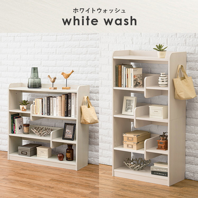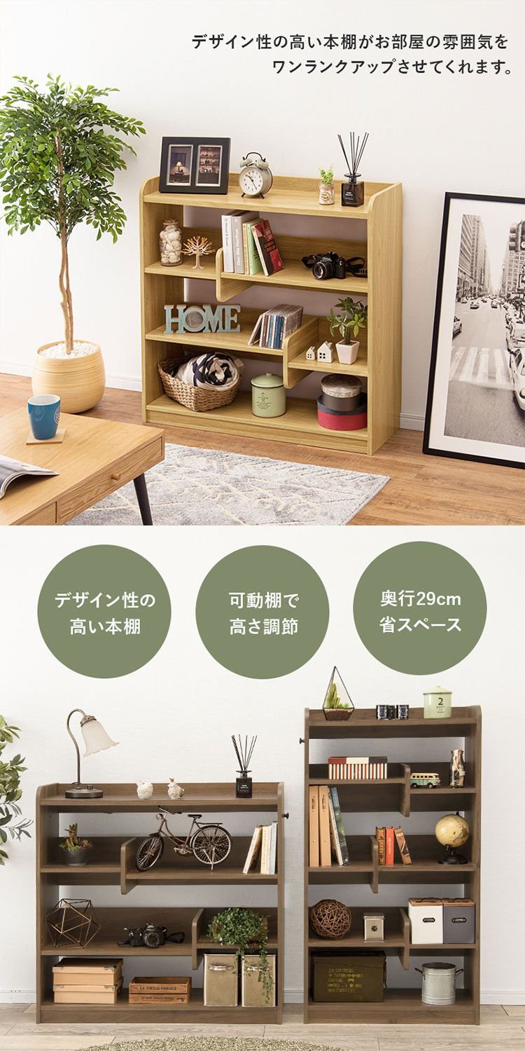 個性的なブックエンド付きでディスプレイもできるおしゃれな本棚。お部屋の間仕切りとしても使用可能。