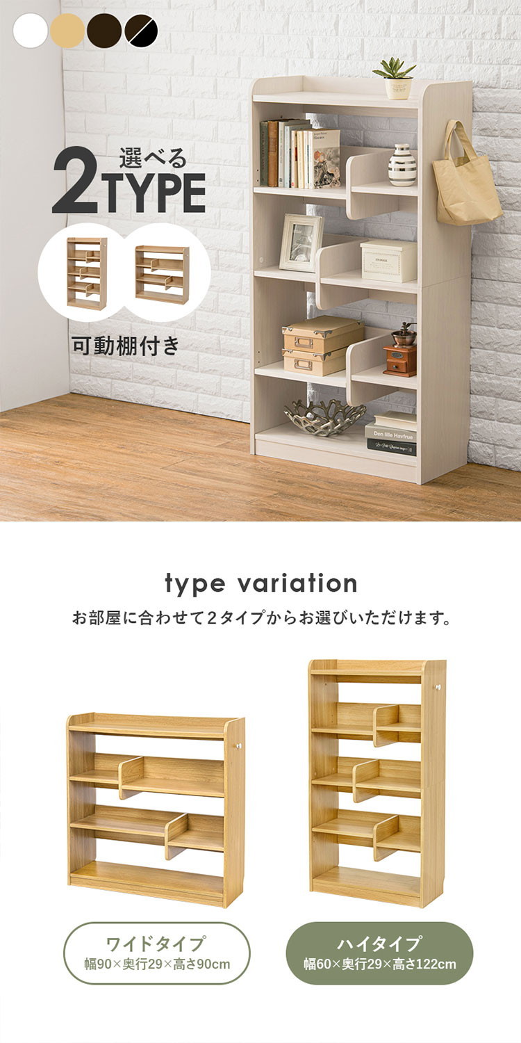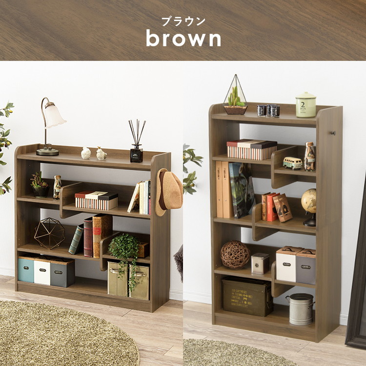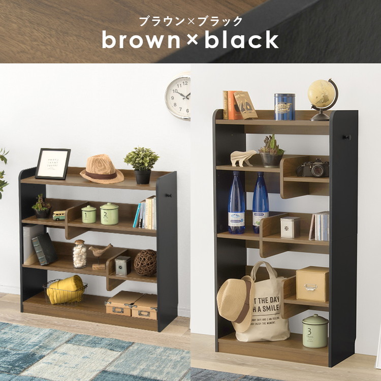 ディスプレイラック 選べる2タイプ 本棚 オープンラック 奥行スリム 可動棚 ブックエンド 仕切り付き シェルフ ハイタイプ/ブラウン×ブラック