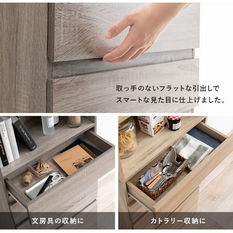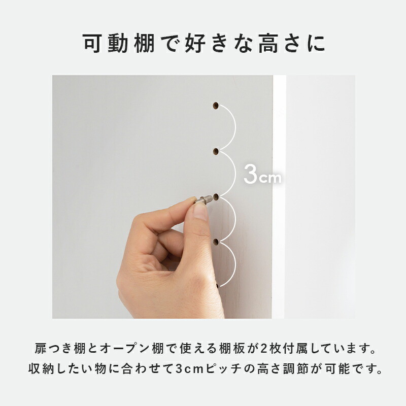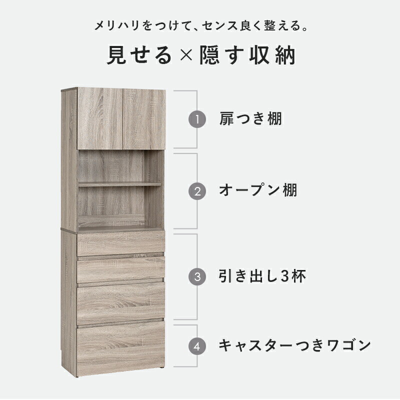 スリムながら、扉付き棚・オープン棚・引き出し3杯・キャスター付きワゴンの組合せで大容量の収納力。