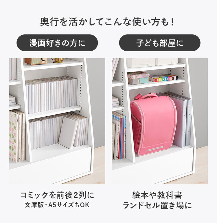 1cmピッチで棚板高さが調節できるシンプルなデザインの本棚。下に行くほど奥行が広くなっており、引出しには日用品の収納もできます。
