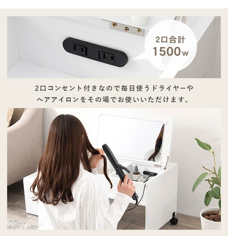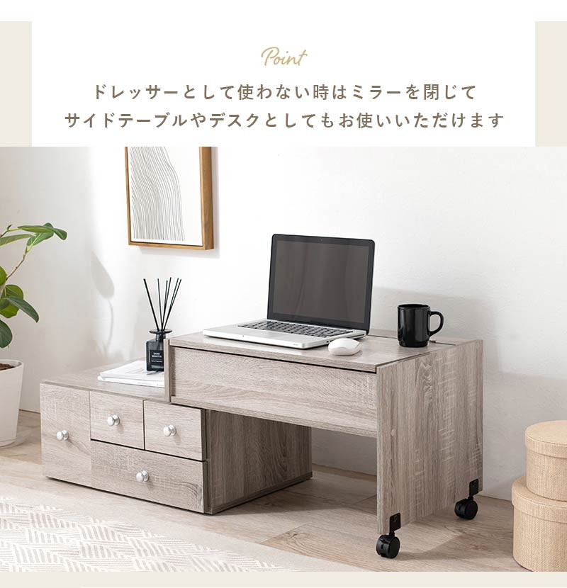 ドレッサーとして使わないときは鏡を閉じて、サイドテーブルやデスクとしてもお使いいただけます