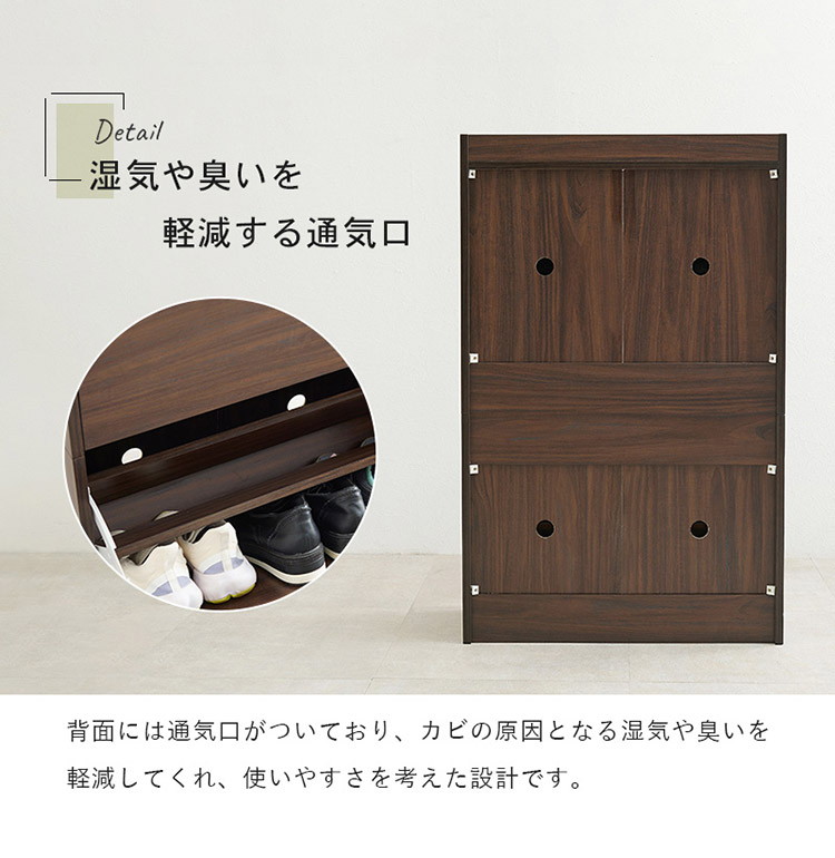 フラップ扉式で奥行スリムなのに大容量収納タイプです。引出し付きで靴のお手入れ道具や玄関小物を収納可能