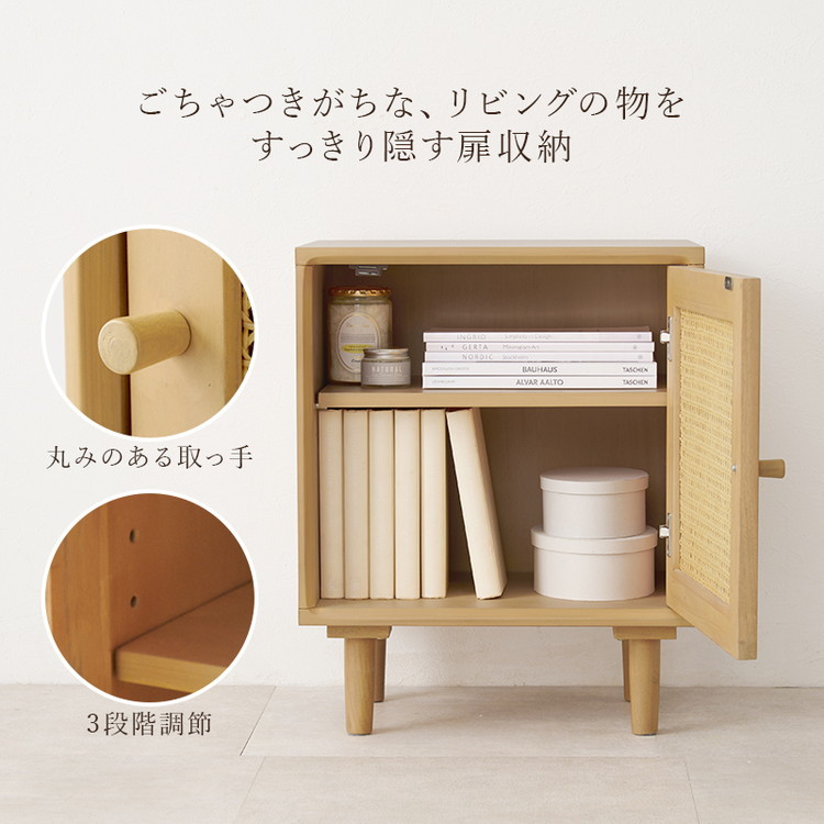 天然素材のラタンでかごめ編みを施した扉が、木のぬくもりに馴染みながら透け感を演出します。