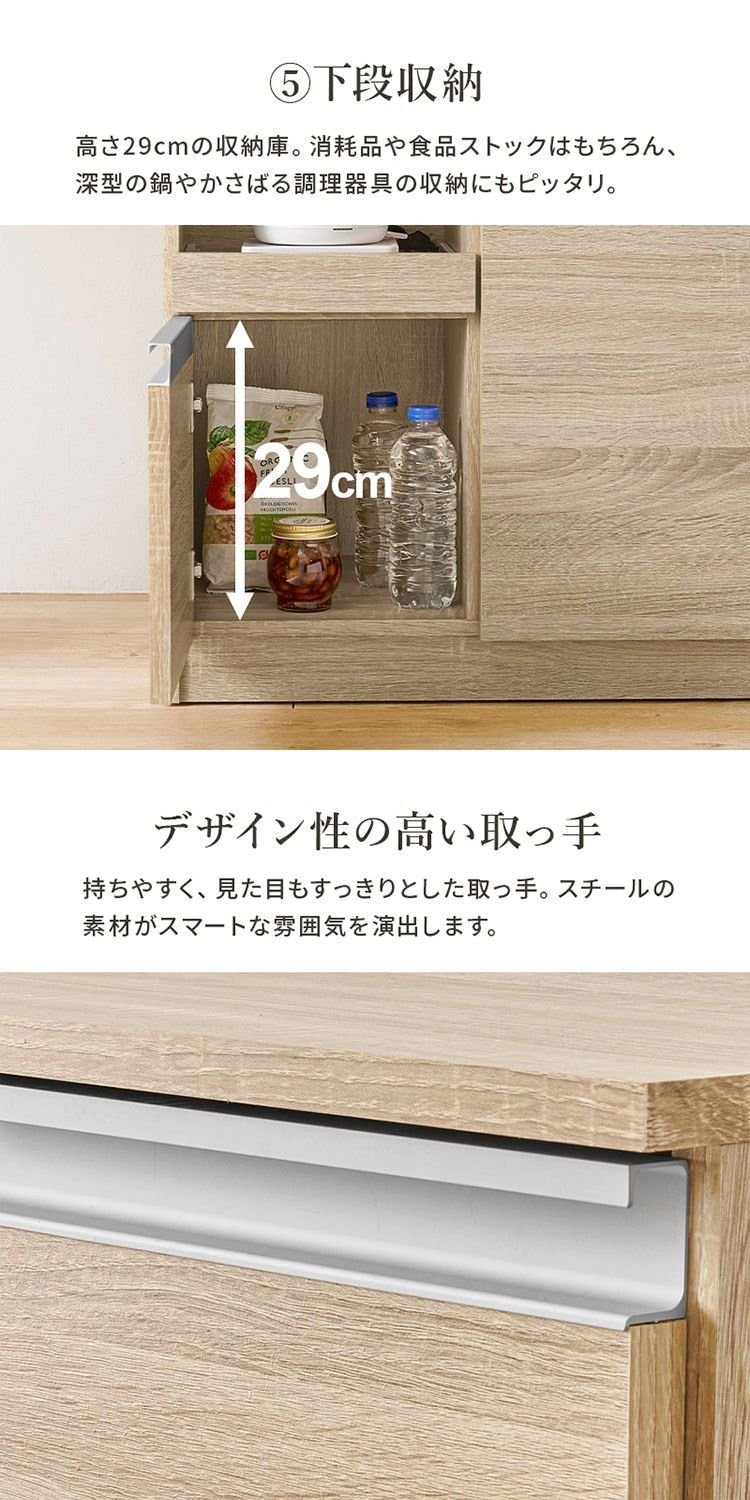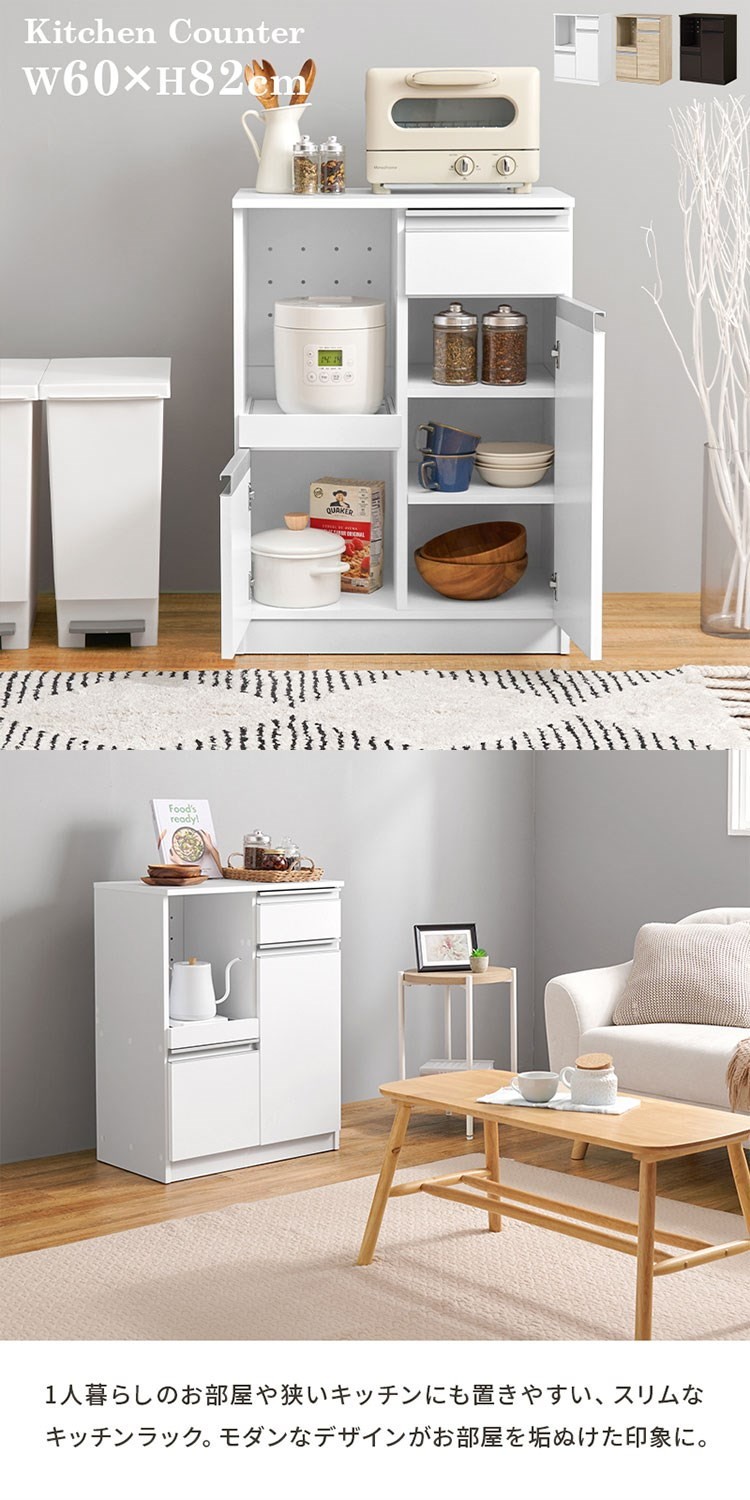 狭いキッチンにも置きやすいスリムなカウンターキャビネット。立てって作業がしやすく、食器や調理器具、キッチン家電がスッキリ片付きます。