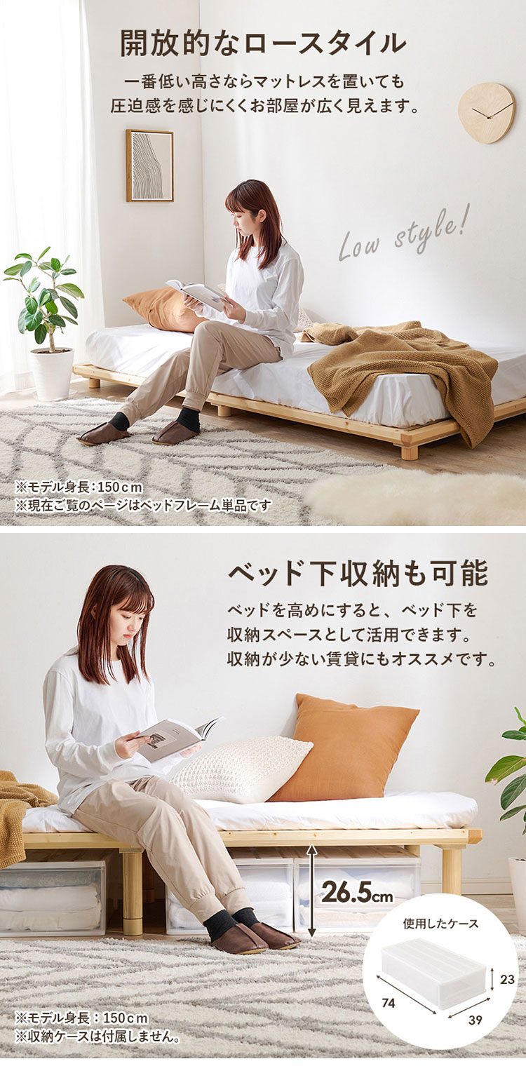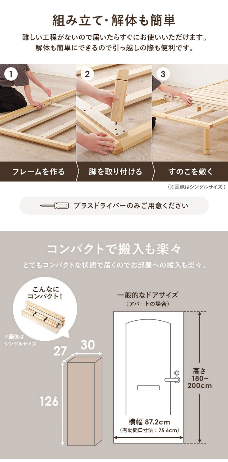 敷布団にも対応したロングサイズ。高さが3段階に変えられる強度にこだわった頑丈すのこベッド。