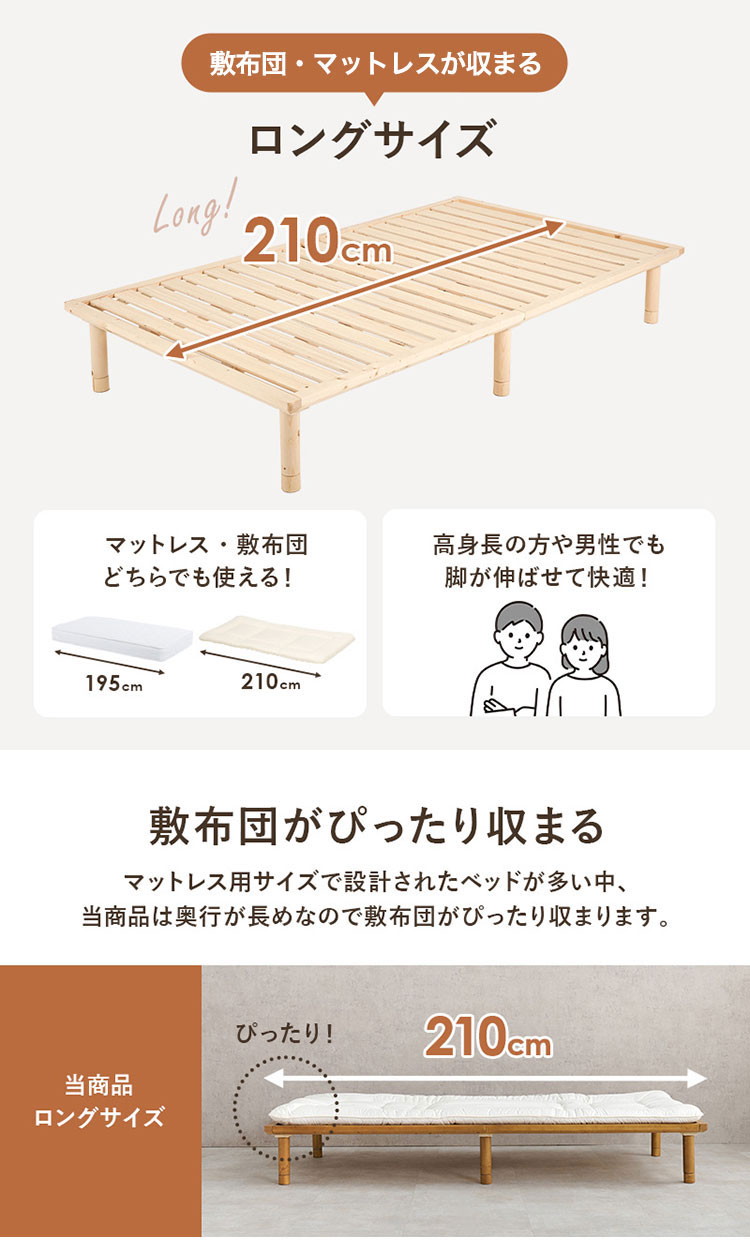 敷布団にも対応したロングサイズ。高さが3段階に変えられる強度にこだわった頑丈すのこベッド。