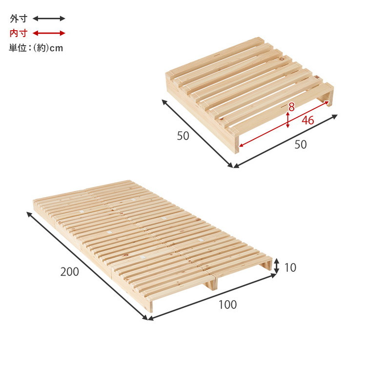 檜(ひのき)の香りや風合いを感じられるすのこベッド。パレット状のすのこ板を並べるだけの簡単設置で移動や模様替えも楽々。