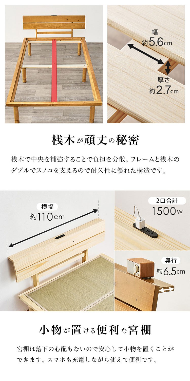 畳ベッド シングル 宮棚付き コンセント付き すのこベッド 畳マットレス 頑丈 耐荷重300kg ライトブラウン/クラマ