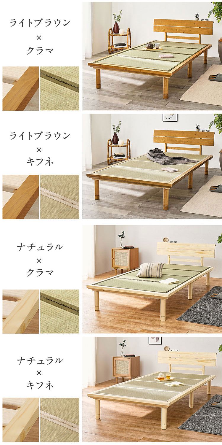 爽やかな天然い草を使用した畳マットをすのこベッドに合わせました。敷布団がそのまま使えるロングサイズです。床面高さは3段階調節可能。