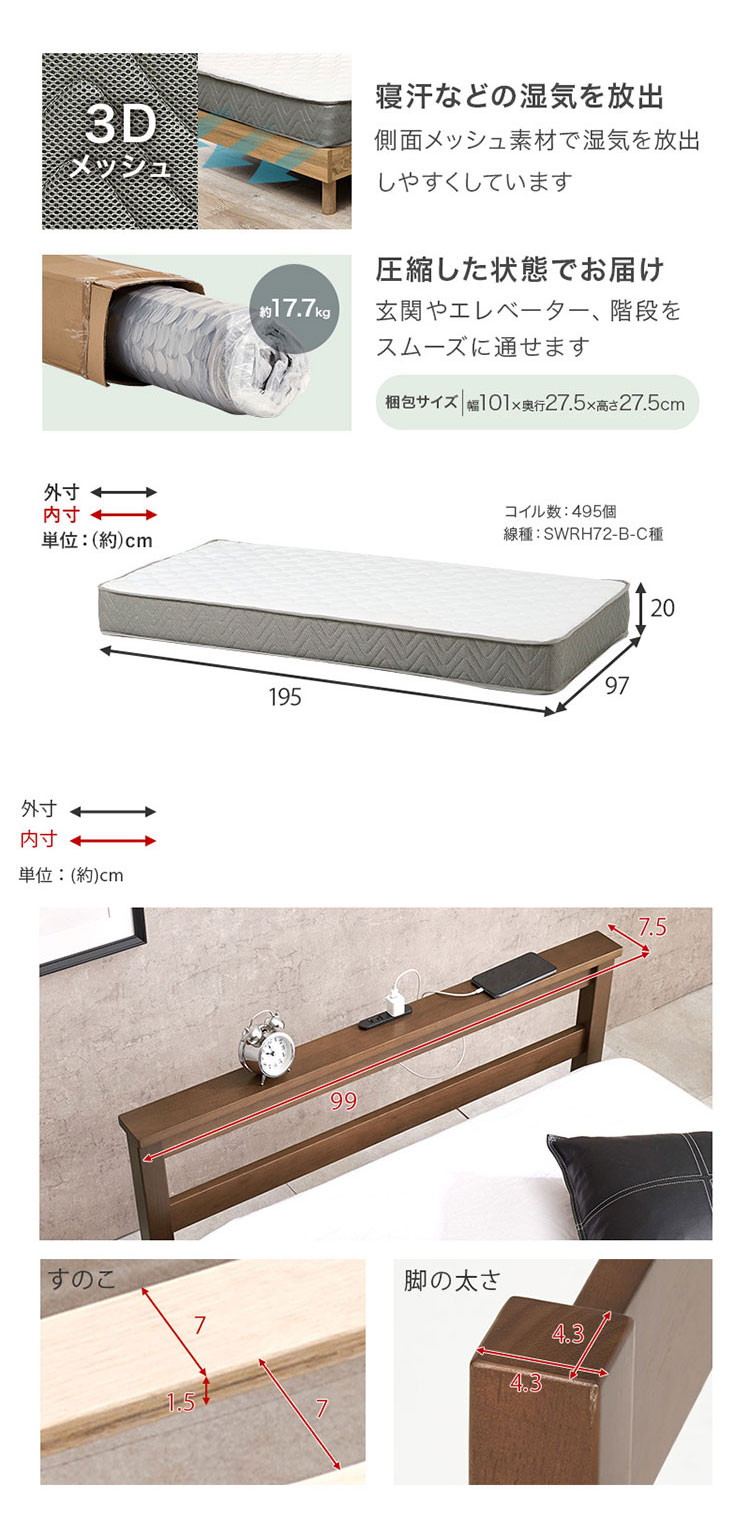 ベッド:ベッド:天然木(ラバーウッド)・プリント化粧パーティクルボード、マットレス:ポケットコイルポリエステル