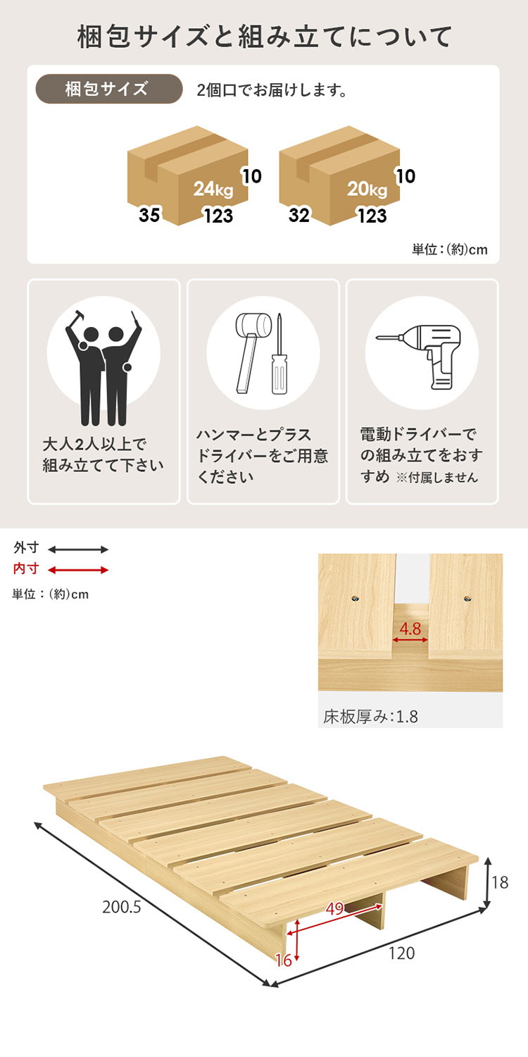 ベッド:(約)幅120×奥行200.5×高さ18cm,マットレス:(約)幅97×奥行195×高さ20cm