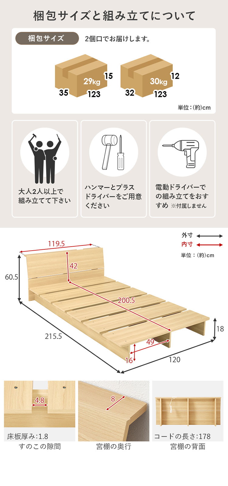 ベッド:(約)幅120×奥行215.5×高さ60.5×床面高18cm,マットレス:(約)幅97×奥行195×高さ14.5cm