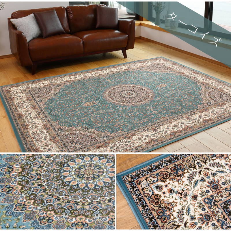 カーペット 絨毯 ラグマット 転写プリントラグ 140×200cm 洋風 エレガント 高級感 滑り止め 撥水加工 はっ水 ターコイズ[240613900]