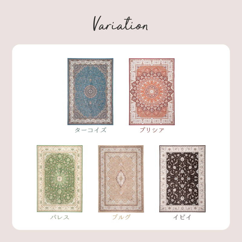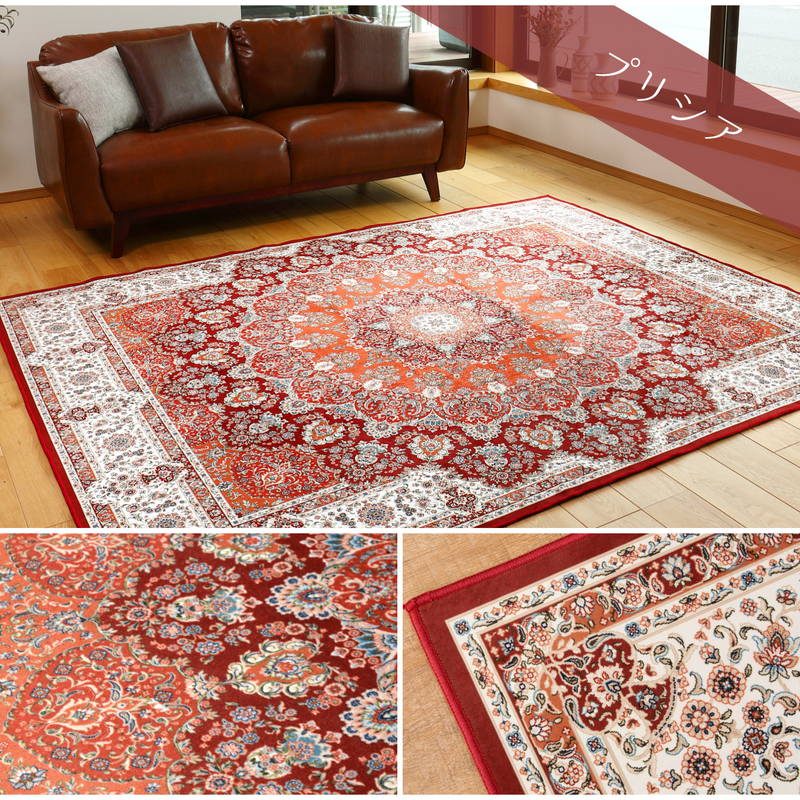 表生地は撥水加工を施したなめらかな生地でオールシーズン使える。高級絨毯風デザインを転写プリントで表現。裏面はすべり止め付きでずれにくくなっている。