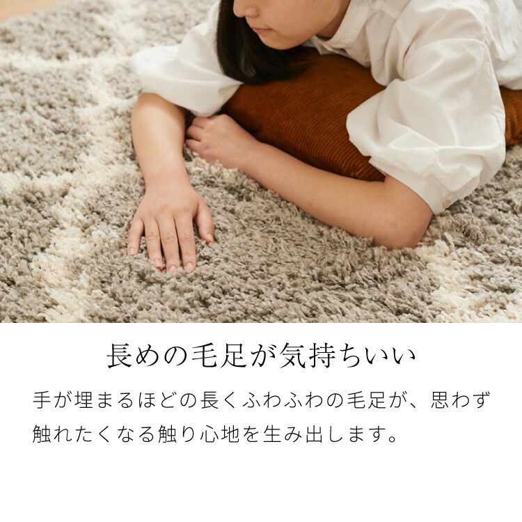 ふわふわとした毛足で肌触りはやわらかく滑らかで、ごろごろとラグのうえで過ごすのもおすすめです。