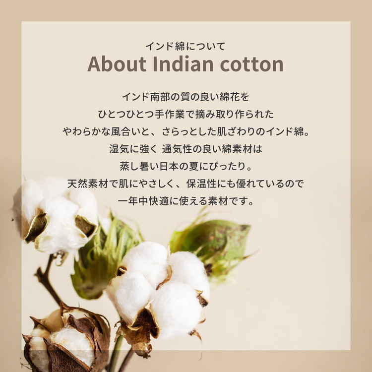 天然素材で肌にやさしく、通気性がよく保温性にも優れたインド綿は、オールシーズン快適にお使いいただけます。