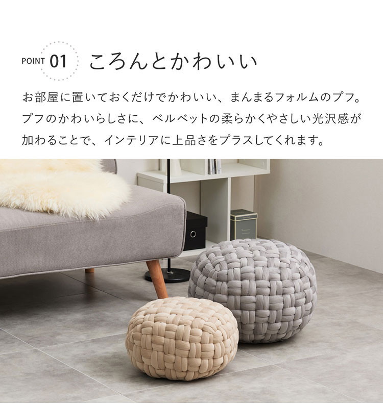 お部屋に置いておくだけでかわいい、まんまるフォルムのプフ。プフのかわいらしさに、ベルベットの柔らかくやさしい光沢感が加わることで、インテリアに上品さをプラス。スツールとして座るのはもちろん、オットマンやサイドテーブルとしてなど、様々なシーンでお使いいただけます。中材には発泡ビーズを使用しており、軽くて持ち運びやすいのもうれしいポイント。