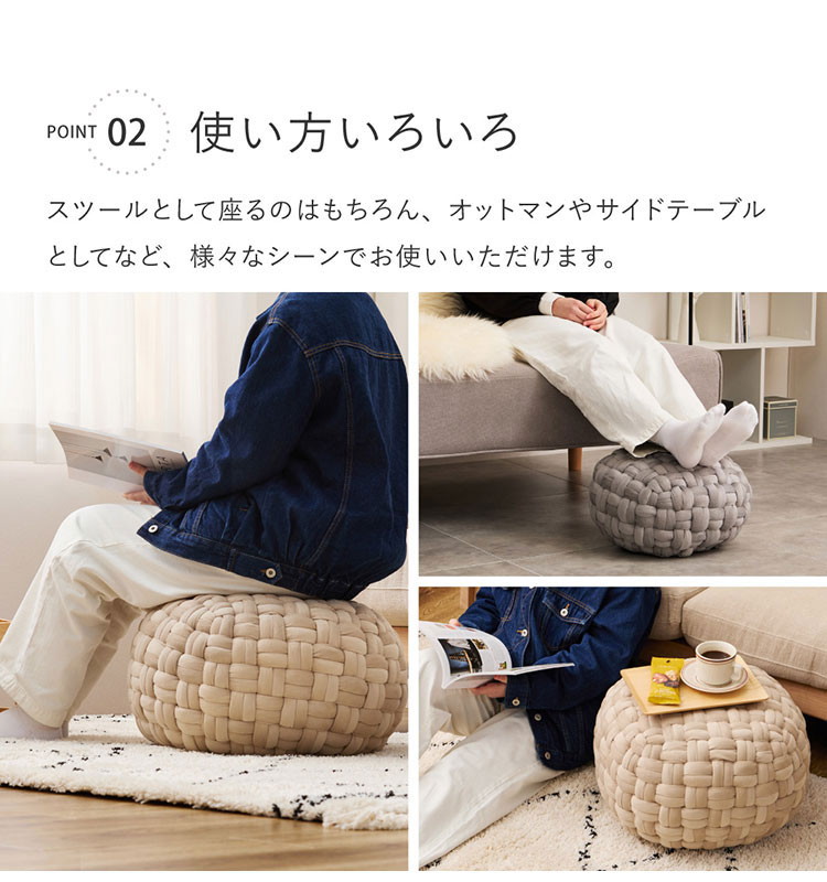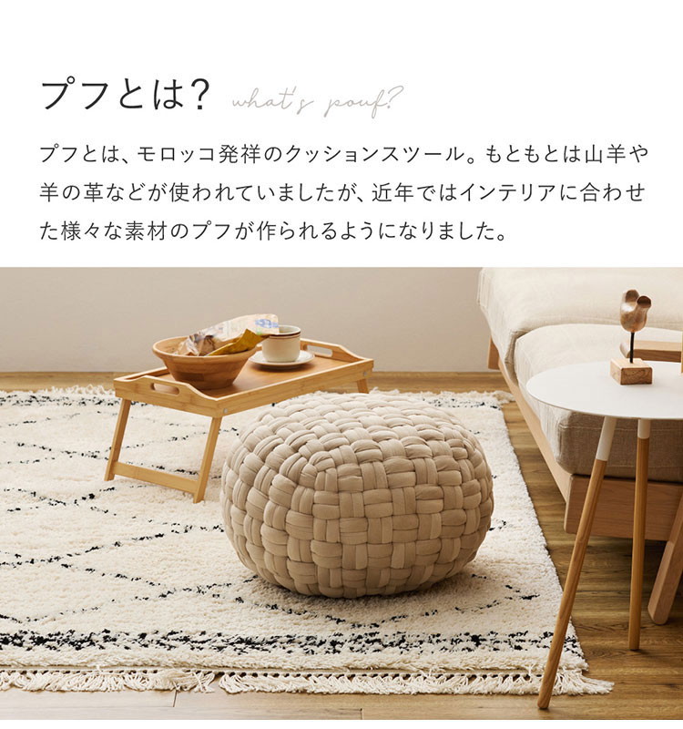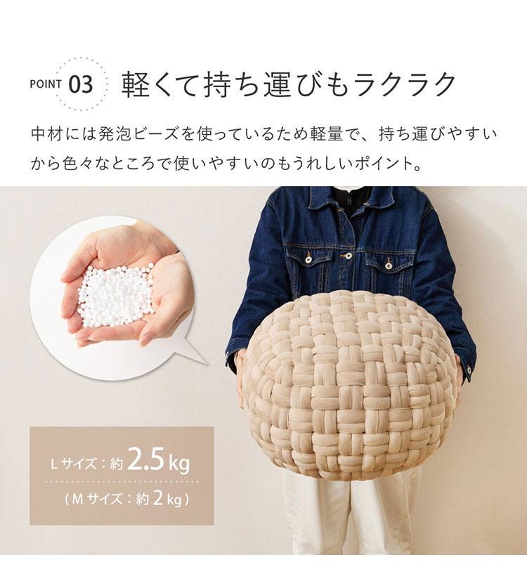 お部屋に置いておくだけでかわいい、まんまるフォルムのプフ。プフのかわいらしさに、ベルベットの柔らかくやさしい光沢感が加わることで、インテリアに上品さをプラス。スツールとして座るのはもちろん、オットマンやサイドテーブルとしてなど、様々なシーンでお使いいただけます。中材には発泡ビーズを使用しており、軽くて持ち運びやすいのもうれしいポイント。