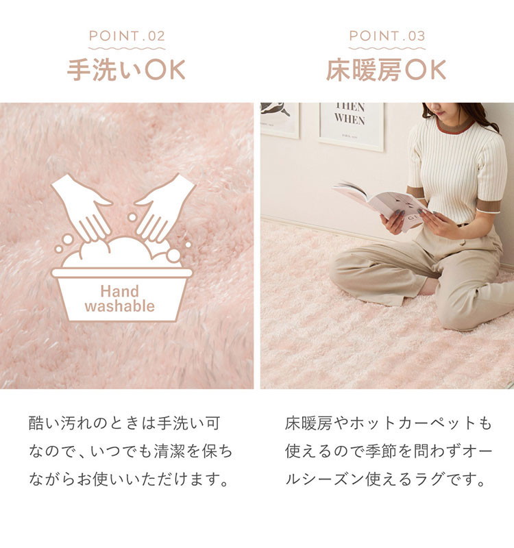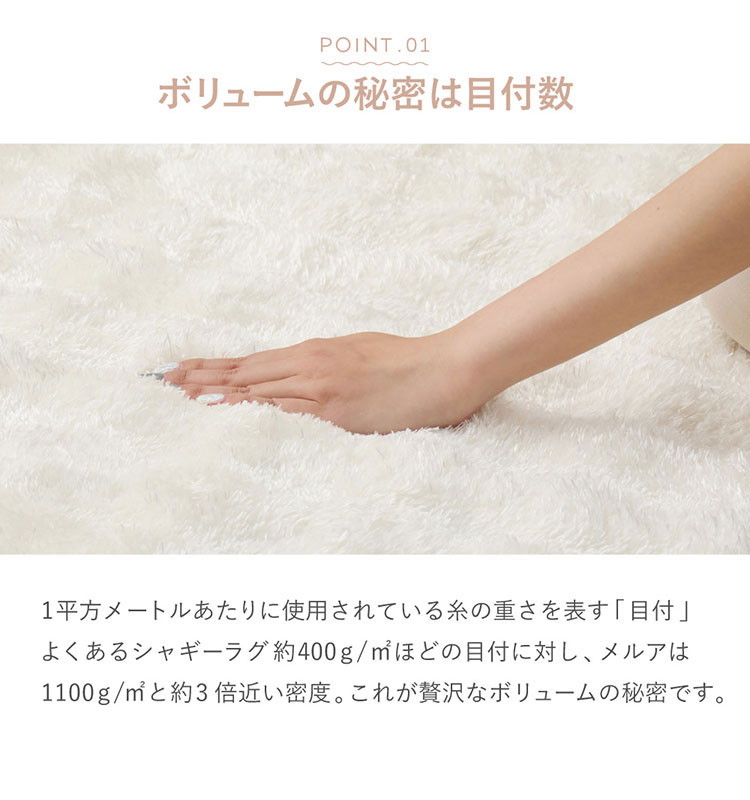 表面をなめらかな凹凸にカットし、独特なポコポコ感を表現。目付量約1100g/平方メートルのしっかりとした密度でボリューム感たっぷりの贅沢な一枚に。光沢のある糸は光の当たり方によって様々な表情をみせてくれます。また、ホルムアルデヒドの試験を乳幼児の基準でクリアしているため、小さなお子さまやペットの居るご家庭でも安心です。裏面にはラグのずれを防止する滑り止め加工付き。ホットカーペットや床暖房の上に敷いてもお使いいただけます。