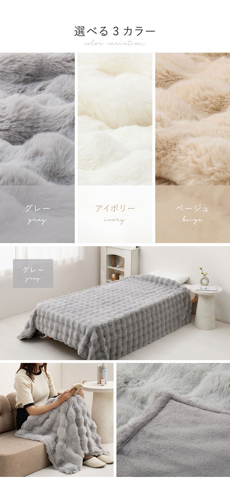 うさぎの毛並みを表現した「ラビットファー調」は、きめ細やかでうっとりするような、なめらかな肌ざわり。やさしく包み込むようなふわふわタッチに、ぽこぽことした見た目も可愛いおしゃれなブランケット。ぎゅっと詰まった高密度な長毛パイルの表生地と、保温性と保湿性に優れたフランネルの裏生地の2枚合わせでほどよくボリュームがあり、しっかりとあたたかさを保ちます。また、汚れても洗濯機で丸洗いできるからいつも清潔&快適にお使いいただけます。