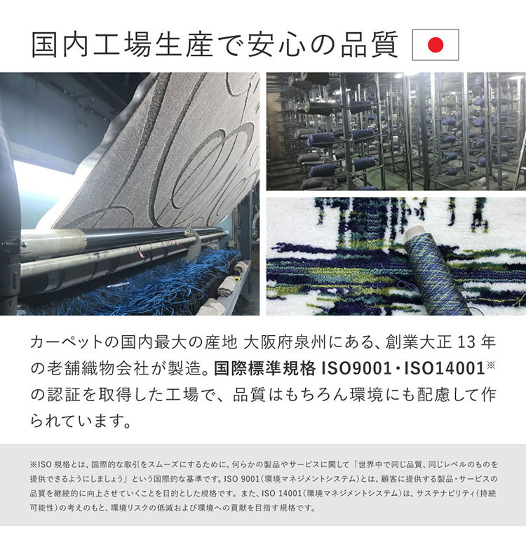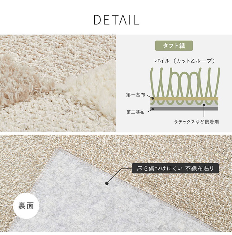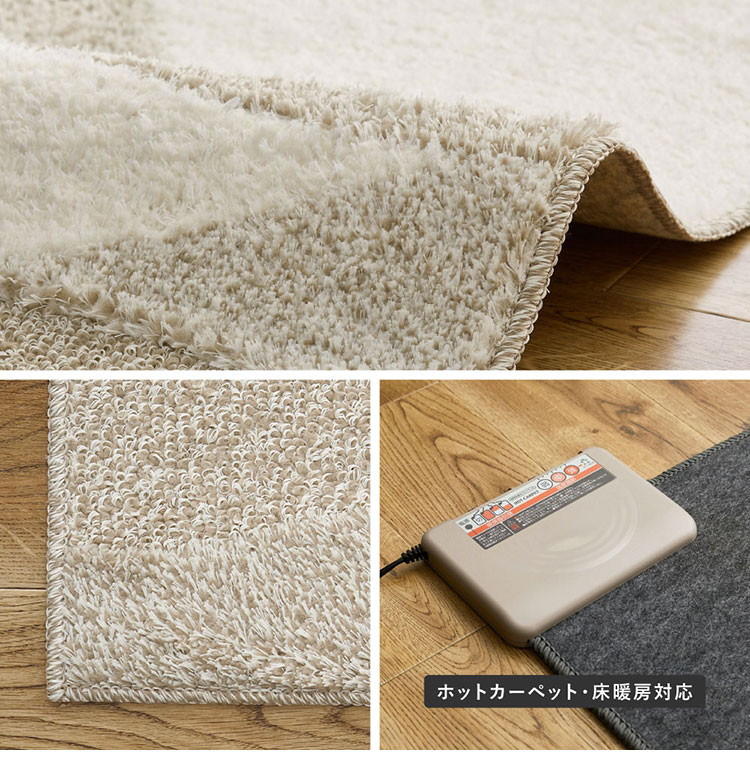 防ダニ・抗菌・抗ウイルス・消臭・花粉対策など、優れた機能を兼ね備えた安心の日本製多機能ラグ。落ち着いた色合いでインテリアにも合わせやすい、おしゃれなモダンデザイン。ふわふわなカットパイルと、さらっとした肌触りのループパイル、異なるパイルを組み合わせることでデザインに立体感が出せ、部分ごとに違うタッチ感が楽しめます。毛足が短くお手入れしやすのもうれしいポイント。裏面は不織布貼りで床を傷つけにくく、ホットカーペット・床暖房対応で、オールシーズンお使いいただけます。