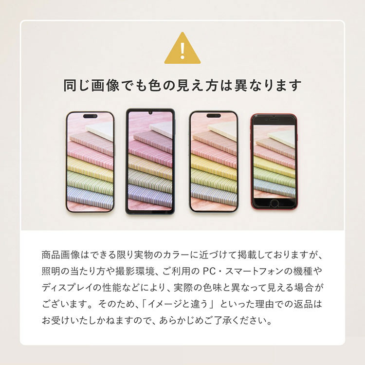 ご利用のモニターやスマートフォンの仕様により、実際の商品と商品画像の色が若干異なる場合がございます。